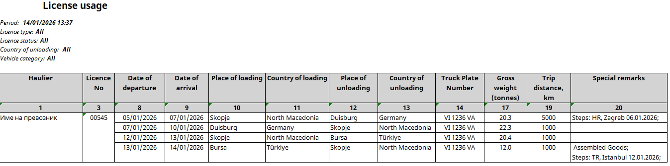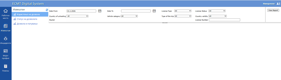 Со најавување на платформата од левата страна има поле извештаи / reports, каде што се наоѓаат информации поединечно за ЕКМТ дозволи со кои располага превозникот и записи за извршените превози со истите. Може да направите генерирање по датуми, да се види статусот на дозволите како и да се направи проверка на искористеноста на ЕКМТ дозволите со број на извршени превози, времетраење на превозите, поминати километри по превоз со стока или без стока и други информации кои се битни за проверка на правилно користење на ЕКМТ дозволите.